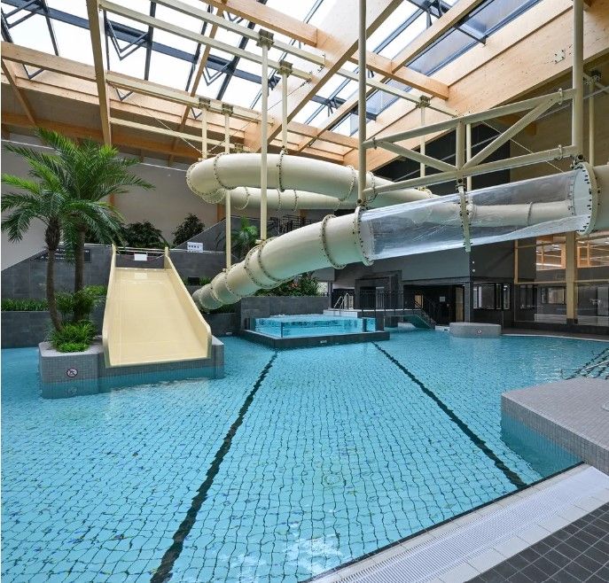 Bijzonder is het clubhuis van scoutinggroep John Mc Cormick. De ‘Chute’, ontworpen door Hans van Leeuwen, is volledig in hout uitgevoerd en heeft een pagodedak dat lijkt op een parachute. Even verderop vind je de Silverdome, een multifunctionele ijshal, en het nieuwe zwemcomplex De Watergeus, geïnspireerd op Japanse badhuizen. Dit gebouw, ontworpen door VenhoevenCS Architecten, is harmonieus geïntegreerd in zijn natuurlijke omgeving.