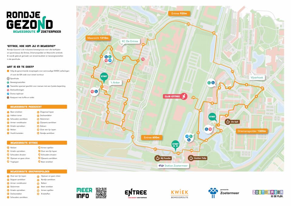 Rondje Gezond is de beweegroute waar iedereen zich welkom voelt. Het is geschikt voor alle leeftijden en sportniveaus. Je komt langs interessante plekken en (groene) randen van de wijken Entree, Driemanspolder en Meerzicht. Het start- en eindpunt is bij station Zoetermeer aan de Boerhaavelaan.